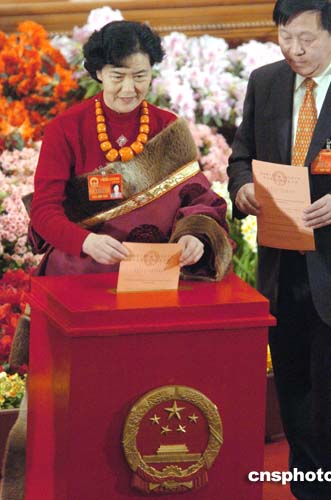 三月十三日上午,十屆全國人大三次會議第四次全體大會在北京人民大會堂舉行,人大代表投票選舉中華人民共和國中央軍事委員會主席。作者:陳文
