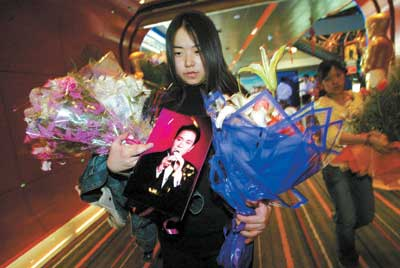 雖然張國榮已經離開了近兩年,但是他的影迷卻一直沒有忘記他。昨天,當記者來到影片《異度空間》首映式現場時發現,現場已經聚集了上百位張國榮的影迷,在影片海報旁擺滿了他們送來的白玫瑰和白百合,上面還插著“哥哥”的生前照片。而影院也配合播放著張國榮的歌曲,很多歌迷也在小聲地隨著哼唱。