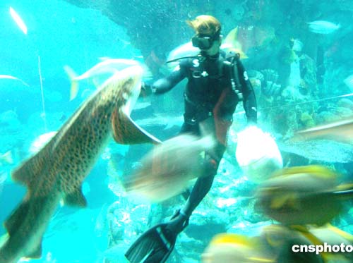 香港海洋公園海洋館的潛水喂養員現場表演。作者:趙振清