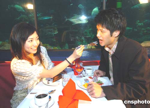 香港海洋公園復活節期間在海洋館推出“海底晚宴”﹐在品嘗美食的同時可欣賞到各種迷人的海洋生物在餐桌旁邊往來游動﹐別有一番風趣。作者:趙振清