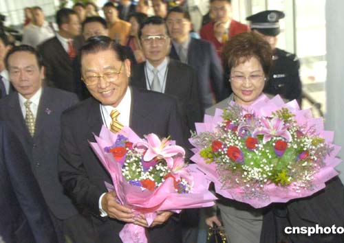中國國民黨副主席江丙坤率領的國民黨高層大陸參訪團一行三十四人,二十八日下午飛抵廣州白云國際機場,開始對大陸進行參觀訪問。參訪團在機場受到熱烈歡迎。作者:羅仰明