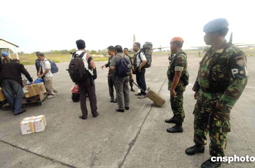 3月31日,印度尼西亞棉蘭某軍用機場召集世界各地電視臺及報章記者,安排乘當地軍用飛機到尼亞斯島災區采訪。作者:洪少葵