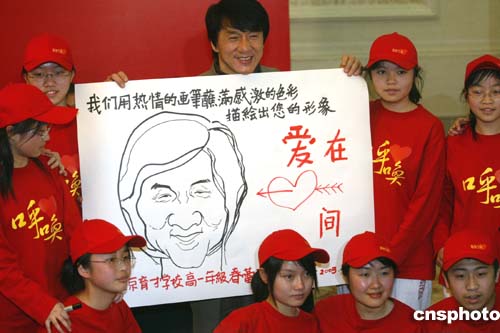 三月三十一日,第四屆“中國兒童慈善活動日”大型情景晚會啟動儀式在北京人民大會堂舉行。本屆“中國兒童慈善日”活動將圍繞“把愛心奉獻給孩子”的主題,以組織開展義賣、義演、義賽、公益短信等多種形式,全力打造“零錢慈善”的公益新概念。圖為香港著名影星成龍在發布會現場接受孩子們現場繪制的肖像。作者:盛佳鵬