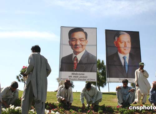 為了迎接中國總理溫家寶對巴基斯坦的正式訪問,巴方在總統府前的迎賓大道兩側樹立起兩國領導人的巨幅畫像。伊斯蘭堡市政局員工阿亞杰馬說,為了表達對中國客人的歡迎和尊敬,“我們希望用我們所能想出的最熱烈的方式歡迎溫家寶總理”。作者:齊彬