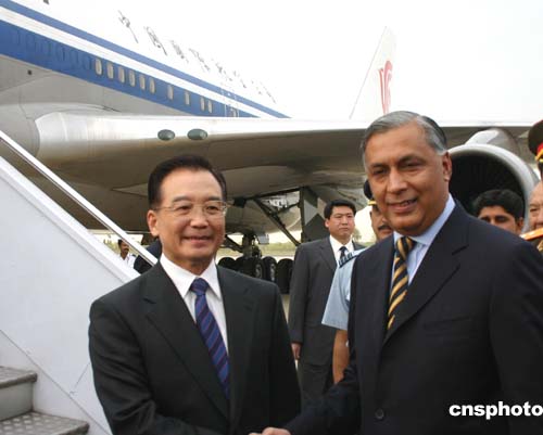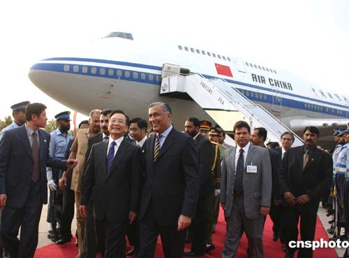 中國國務院總理溫家寶四月五日傍晚抵達伊斯蘭堡空軍機場,巴基斯坦總理阿齊茲親往機場迎接。作者:齊彬