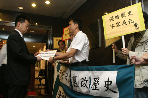 香港索償協會、新論壇等社會團體代表8日到日本駐港總領事館遞交請愿信,強烈抗議日本政府審訂通過美化戰爭暴行的所謂新版歷史教科書,要求日本政府停止所有歪曲歷史、軍事擴張的不當行徑。