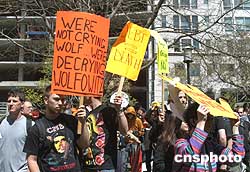 世界銀行春節(jié)會議在華盛頓舉行之際,美國示威者于美東時間4月16日中午到世行大樓外集會,抗議美國國防部副部長沃爾福威茨出任世界銀行新任行長。作者:余東暉