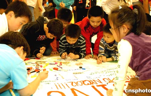 四月二十一日,紐約市申辦奧運會執行委員會和基督教青年會(YMCA)聯合主辦“慶祝二00八年北京奧運成功和紐約申辦二0一二年奧運成功”活動,紐約小學生用彩筆簽名表達祝愿。作者:龔文謨