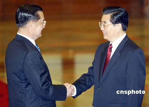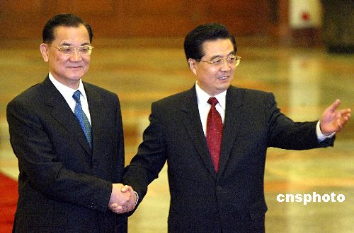 四月二十九日,中共中央總書記胡錦濤在北京人民大會堂會見中國國民黨主席連戰。作者:廖文靜