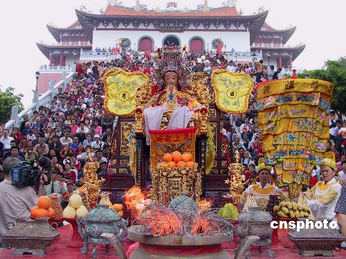 中新社莆田五月一日電(記者王東明)五月一日(農歷三月二十三)是聞名海內外的海上和平女神媽祖誕辰一千零四十五周年紀念日。以“海峽兩岸同謁媽祖,中華兒女共享平安”為主題的紀念媽祖誕辰系列活動在媽祖文化的發(fā)源地福建莆田湄洲島隆重舉行。四十八個臺灣媽祖文化機構,上千名海內外媽祖信眾前來拜祭。