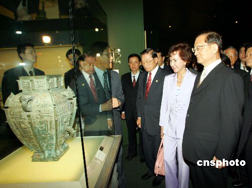 五月二日,連戰(zhàn)一行在上海博物館參觀,連戰(zhàn)夫婦對該館陳列的青銅器饒有興趣。作者:潘索菲