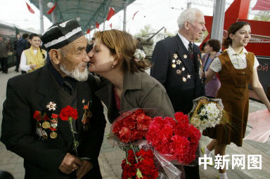 5月8日,俄羅斯妙齡女郎在火車站迎接乘火車抵達莫斯科參加紀念衛國戰爭慶典的二戰老兵。