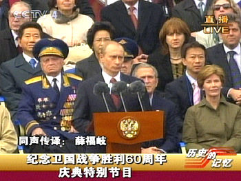 5月9日,俄羅斯在莫斯科紅場舉行紀念衛國戰爭勝利60周年慶典。圖為俄羅斯總統普京發表講話。(央視截圖)