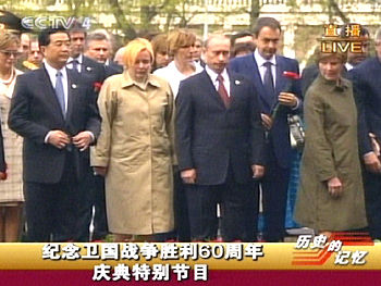 5月9日,俄羅斯在莫斯科紅場舉行紀念衛國戰爭勝利60周年慶典。圖為各國元首向無名烈士墓獻花,中國國家主席胡錦濤出席儀式。(央視截圖)