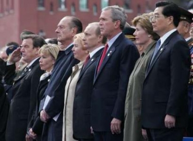 獻花結束以后,各國領導人在一旁的小廣場集體合影,接著出席普京總統在克里姆林宮大會堂六層宴會廳舉行的紀念衛國戰爭勝利六十周年宴會。