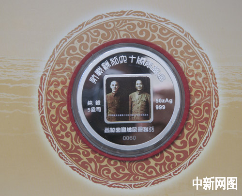 紀(jì)念幣正面是中國(guó)抗戰(zhàn)時(shí)的國(guó)共兩黨領(lǐng)袖的合影,背面是中國(guó)軍民奔赴抗戰(zhàn)前線,浴血奮戰(zhàn)的浮雕。紀(jì)念幣用5盎司純銀鑄造,面值300美元,全世界發(fā)行1000枚。