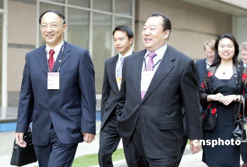 五月十五日,二○○五財富全球論壇在北京舉行體育圓桌會歡迎酒會,國家體育總局局長劉鵬(左)出席酒會。作者:廖文靜