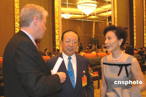五月十七日晚,前來參加第七屆海峽兩岸經(jīng)貿(mào)交易會(huì)的臺(tái)灣知名人士蔣孝嚴(yán)與夫人黃美倫在福州香格里拉大酒店與海外工商界人士親切交談。作者:福建分社