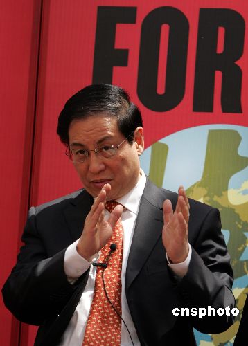 2005北京《財富》全球論壇5月18日專門舉行“中國銀行業改革近況”會議,中國銀監會主席劉明康(左)在會上介紹:中國的銀行2003年能夠達到全球標準的資金只有0.5%,2004年達到了47%以上,到2006年之前80%的銀行在這方面的資產將達到國際標準。作者:任晨鳴