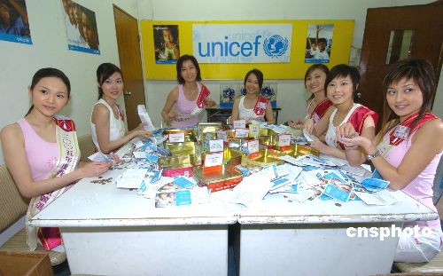 參加《2005年度香港小姐競選》20位候選佳麗9日來到香港聯合國兒童基金會﹐將社會捐助的各種錢幣進行整理﹐以此來表達對有需要人士的幫助。作者:趙振清