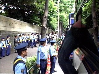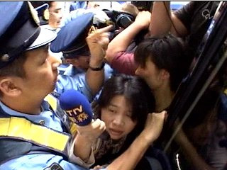 游覽車被現場日本的強勢警力包圍,有記者決定下車拍攝,不過就在下車瞬間,日本警察就一擁而上,女記者被推擠的像沙丁魚一樣,扭曲變形,日本警察就是不準臺灣媒體下車采訪,這時一位攝影記者只好跳車,但還是被日本警方再推回車上。