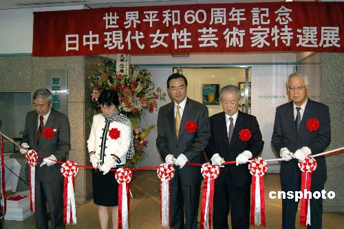 中新社東京六月十五日電(記者滕劍峰)由中國對外友協和日中友好會館共同舉辦的“世界和平六十周年紀念日中現代女性藝術家特選展”開幕式今天在日中友好會館舉行。中國駐日大使王毅、中國對外友協副會長李小林、日中友好會館理事長村上立躬及部分中日女藝術家代表參加。