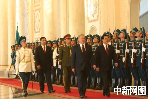當地時間七月三日傍晚,哈薩克斯坦總統納扎爾巴耶夫在總統府舉行隆重的歡迎儀式,歡迎到訪的中國國家主席胡錦濤。
