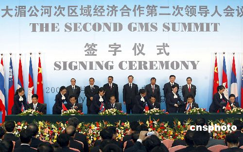 七月五日,大湄公河次區域經濟合作第二次領導人會議在昆明召開,大湄公河次區域領導人在會后參加了合作簽字儀式。作者:廖文靜