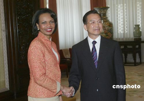 中新網(wǎng)北京七月十日電(記者李靜)中國國務(wù)院總理溫家寶十日在北京會見美國國務(wù)卿賴斯時強調(diào),中國堅持走和平發(fā)展道路;中國現(xiàn)在沒有,將來也不會干涉和威脅任何國家。
