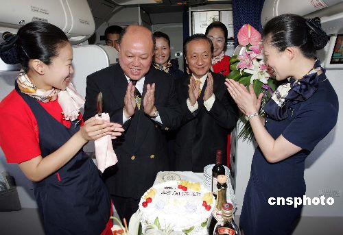 新黨大陸訪問團今天上午從大連乘坐中國南方航空公司班機前往北京。在飛機上升到七千八百米的高空時,南航機組的空中小姐將事先準備好的生日蛋糕送到李勝峰道面前,在眾人的歡呼聲中,新黨主席郁慕明向李勝峰祝賀生日。李勝峰在記者的請求下大聲說出自己的生日心愿:訪問成功。