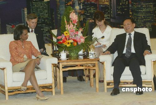 七月十日,中國國務委員唐家璇在北京人民大會堂會見來訪的美國國務卿賴斯。作者:史利