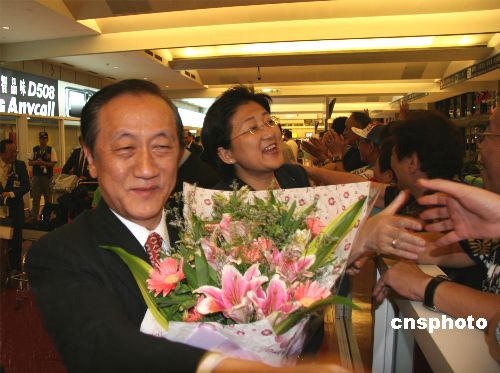 新黨主席郁慕明結束在大陸八天的“民族之旅”,七月十三日晚間十點左右抵達臺北,在機場受到支持群眾的歡迎。作者:路梅