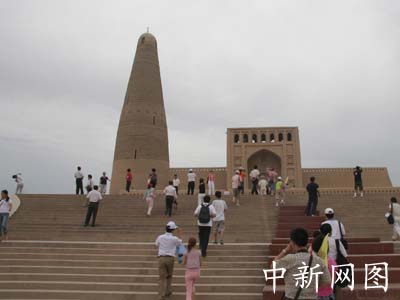整個建筑群由古塔和清真寺兩大部分組成的,古塔是灰磚結構,為清代維吾爾建筑大師伊不拉欣所建,除了頂部窗欞外,基本不用什么木料。塔身渾圓,自下而上,逐漸收縮。塔基直徑達10米。通高有40米。塔身中心是用灰磚砌起的粗粗實實的一個圓形柱。圓柱蜿蜒向上,同樣使用磚塊砌起的階梯,呈螺旋形鋪展。憑階拾級而上,可一直登臨塔頂。塔身內部是十分幽暗的,隔相當距離才洞開一點小孔,透射進來一點點光線,簡直難以看清腳下的虛實,自然而然,使人會產生一種神秘感。直塔頂,有一個大約10平方米的小小閣樓。四周是敞開的大窗。