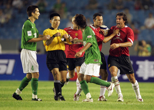 26日晚間,曼聯(lián)隊(duì)以3比0擊敗了北京國安隊(duì),不過本場比賽場上火藥味十足。第68分鐘,曼聯(lián)隊(duì)從左路進(jìn)攻,張帥一個非常危險的飛鏟引起了曼聯(lián)隊(duì)員的強(qiáng)烈不滿,雙方球員糾纏一起,場面比較混亂,主裁判給了肇事者張帥一張黃牌。此后西爾維斯特鏟球時嚴(yán)重犯規(guī)放倒了高大偉,也被主教練黃牌警告。圖據(jù)華奧星空