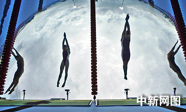 圖為參加世界游泳錦標賽女子1500米自由泳決賽選手們在比賽開始時的瞬間照片。