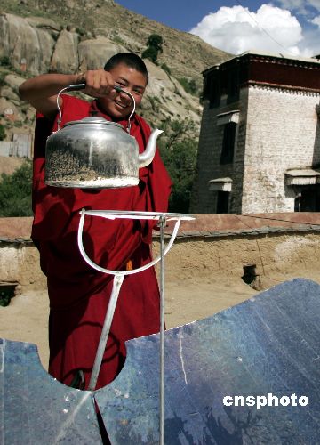 夏日的西藏色拉寺,一位僧侶在使用太陽能灶燒水。西藏自治區實施“陽光計劃”十多年以來,全區已累計建立三千瓦至五千瓦的光伏電站三百多座,推廣各類小型獨立光伏發電系統約五千四百千瓦,已有近五十多萬農牧民因此告別了無電歷史。在西藏,太陽能資源已用于照明、通訊、廣播電視、燒水做飯、取暖等方面。作者:武仲林