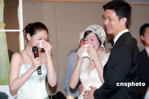 七月二十九日,臺(tái)灣著名藝人“小S”徐熙娣(中)與許雅鈞(右)在臺(tái)北舉行訂婚典禮,大S徐熙媛(左)祝賀妹妹幸福,高興得自掉眼淚。作者:盛佳鵬