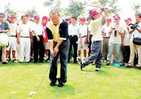 曾志偉是昨天一早先于明星隊伍到達現(xiàn)場的。前段時間一直坐在輪椅上的他已經可以一瘸一拐地下地走路了,而且堅持不讓別人攙扶,總算順利打出了漂亮的第一桿。