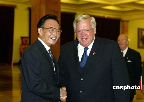 八月四日,全國人大常委會委員長吳邦國在北京與美國眾議長哈斯特德舉行會談。作者:廖文靜