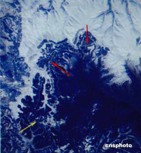 美國宇航員在國際空間站拍攝的中國內(nèi)蒙古境內(nèi)的一段長城,紅色和黃色箭頭所指的細(xì)小地段,距北京西北部約二百五十英里。作者:賈國榮