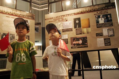8月10日,兩位小朋友在參觀“12·13———侵華日軍南京大屠殺史實(shí)展”。這場以“愛國、正義、和平”為主題,反映南京大屠殺史實(shí)的展覽在中國國家博物館舉行。此次展覽是中國抗日戰(zhàn)爭暨世界反法西斯戰(zhàn)爭勝利60周年紀(jì)念活動(dòng)的一部分,80%以上展品都是首次面世。展覽由江蘇省委、省政府主辦,免費(fèi)對(duì)公眾開放,計(jì)劃展期20天。作者:陳曉根