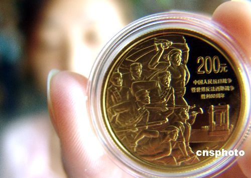 中國人民銀行于2005年8月15日發行中國人民抗日戰爭暨世界反法西斯戰爭勝利60周年金銀紀念幣一套。該套紀念幣共2枚,其中金幣1枚,銀幣1枚,均為中華人民共和國法定貨幣。作者:馬健