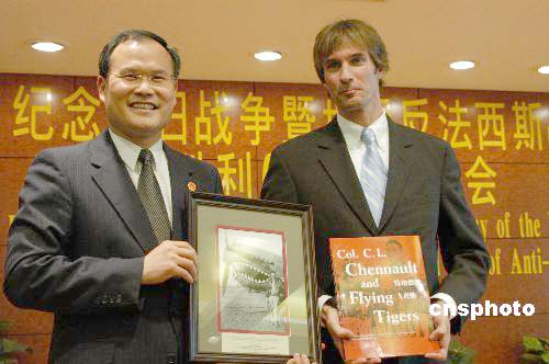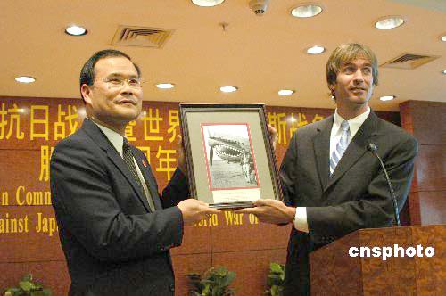 八月十七日,中國駐紐約總領館舉行招待會,紀念抗日戰爭和世界反法西斯戰爭勝利六十周年。當年飛虎隊的飛行員DONALD LOPEZ委托朋友(右)將其珍貴的歷史照片贈與中國駐紐約總領館總領事劉碧偉(左),劉碧偉回贈中國出版的《陳納德將軍和飛虎隊》畫冊。作者:譚宏偉