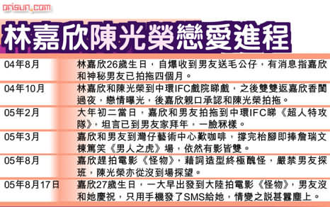 嘉欣和陳光榮自去年四月開始拍拖,陳光榮是鄭伊健御用唱片監(jiān)制,嘉欣經(jīng)伊健介紹認(rèn)識(shí)陳光榮,最初兩人只是好朋友,后來(lái)陳光榮和妻子婚姻出現(xiàn)問題,嘉欣常陪在身邊為他分憂,結(jié)果在陳光榮和妻子離婚后,兩人擦出愛火熱戀,去年十月兩人拍拖到看戲,陳光榮當(dāng)晚更到嘉欣香閨過夜,被傳媒踢爆戀情。