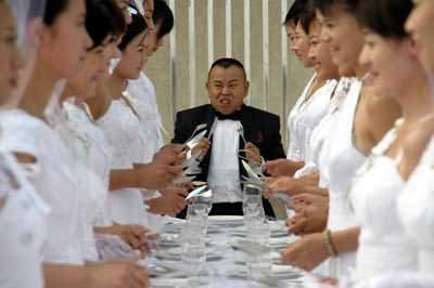 昨天,奧體中心游泳館的一個平臺上,一下子出現(xiàn)了三十位身穿白色婚紗的新娘,這個場面難道是有人在這里組織集體婚禮?看到一旁的攝影機(jī),才知道原來這里是潘長江處女專輯《男人40一枝花》同名歌曲MV的拍攝現(xiàn)場。一張長條桌子兩側(cè)站著30位漂亮的新娘,而眾星捧月之中是身穿黑色燕尾服的笑星潘長江。最搞笑的是當(dāng)老潘揭開面前一只巨大的盤子蓋,原以為是大餐的他失望地發(fā)現(xiàn)里面只放著一個小漢堡。