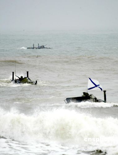 十一時三十八分,在十二架武裝直升機掩護下,俄方一個海軍陸戰連、十輛裝甲輸送車和中方一個兩棲裝甲營、三十三輛裝甲戰車搶灘登陸。十一時四十分,第一波登陸兵順利搶灘上陸,奪占“敵”灘頭陣地。十一時五十二分,聯合部隊三艘登陸艦抵灘,搭載裝甲步兵營的三十二輛步戰車涉水上陸,作為二梯隊遂行奪占鞏固登陸場行動。