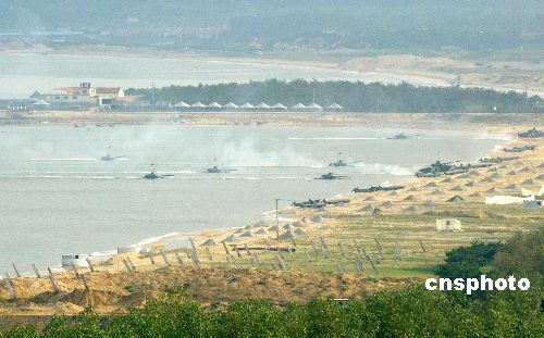八月二十四日,“和平使命—2005”中俄聯合軍事演習第三階段兩棲登陸作戰實兵演練在山東半島展開。圖為兩棲登陸作戰實兵演練的裝甲車向岸防沖擊。作者:王麗南