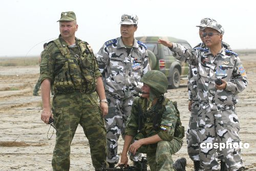 “和平使命-2005”中俄聯合軍事演習最后一個實兵行動課目——強制隔離作戰演練,25日上午在濟南軍區濰北靶場舉行。圖為中俄空軍軍官在演習區域交流任務完成情況。作者:王麗南