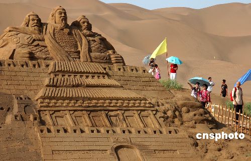 8月27日,幾名游客在欣賞沙雕作品。第二屆中國沙雕藝術節在新疆鄯善縣庫木塔格沙漠沙雕城開幕,共有12組反映新疆歷史文化、民風民俗的沙雕作品向游人開放。作者:劉健