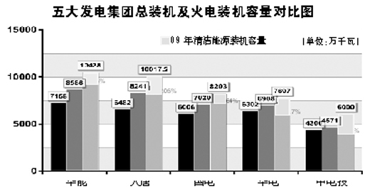 五家發電集團的工作報告顯示,清潔能源發電比重自“十一五”以來得到了大幅增長。其中,中電投的清潔能源發電裝機容量占總裝機容量比重高達30%,拔得頭籌。根據2008年國家電監會發布的《2007年電力企業節能減排情況通報》(以下簡稱《2007年通報》),中電投2007年裝機容量4300萬千瓦,其中火電裝機3327萬千瓦,占77.37%。根據2009年國家電監會發布的《2008年電力企業節能減排情況通報》(以下簡稱《2008年通報》),這一比例并沒有發生太大變化。但2009年以來,中電投的清潔能源發電比重增加到了30%。拉西瓦水電站實現一年四投使中電投的水電裝機容量居五大發電集團之首。預計隨著海陽核電、紅沿河核電和彭澤核電等項目的推進,這一比重還會大幅提升。